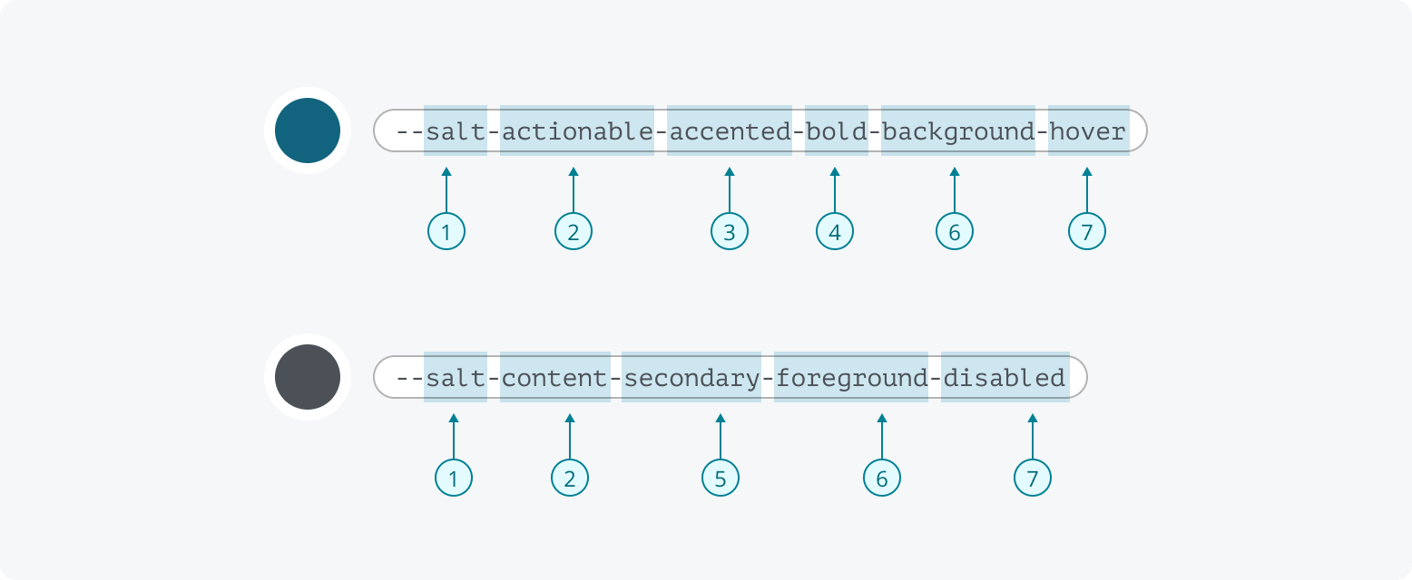 - Design system prefix*: A term that clearly attributes the token to Salt.